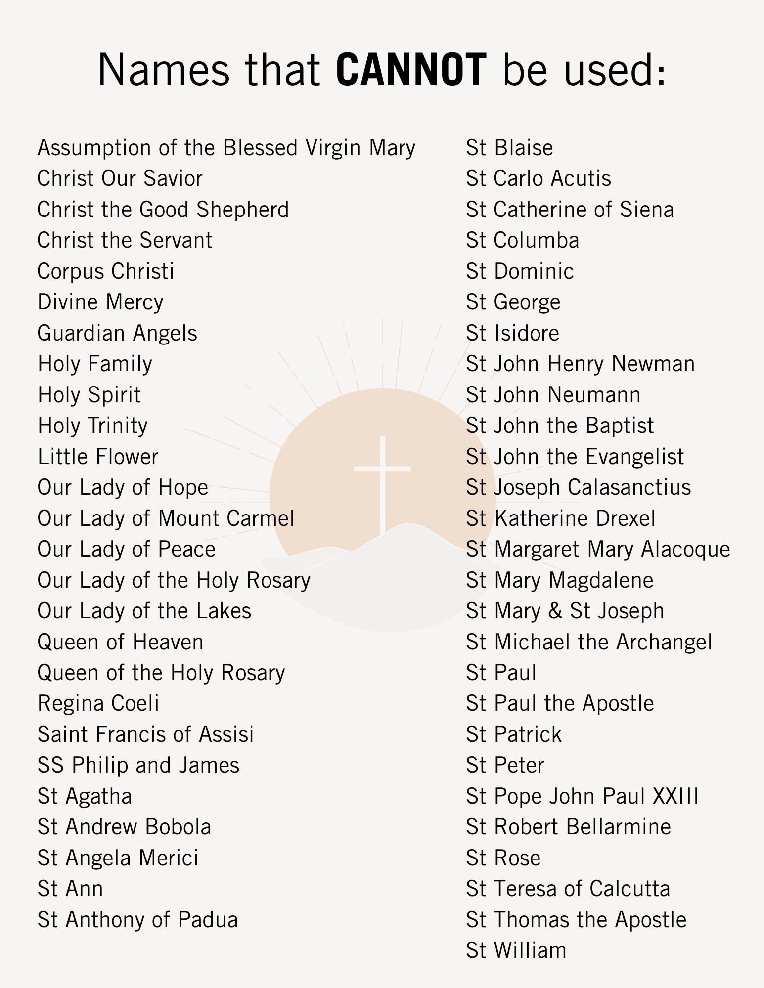 - It cannot be the name of an existing parish in the Diocese of Youngstown (see list).